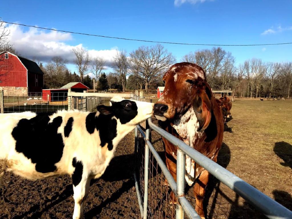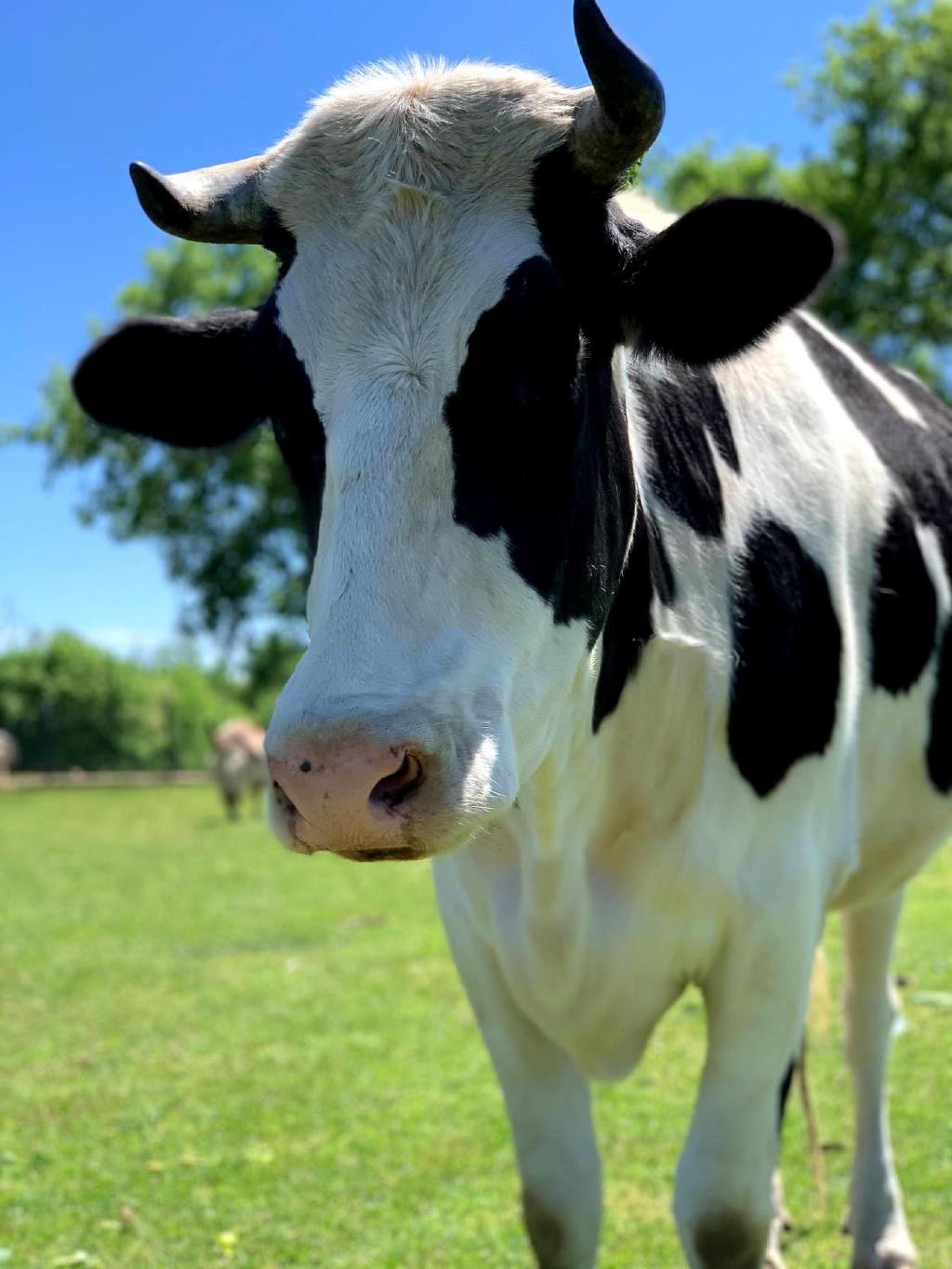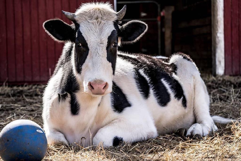 Daisy Belle is a female Holstein, born on a dairy farm. She was born with a male twin. The male was removed by the farmer to be raised and sold for meat, but Daisy Belle was found to be sterile, in addition to having congenital cataracts. She was put in a pen, not fed, and left to die. A kindly neighbor convinced the farmer to let her take the calf. Daisy Belle arrived at SASHA at the age of only three weeks and was bottle fed for many months. She had many health issues, including pneumonia. Although she will always be small, she has regained her health and is very playful and curious about everything around her. Although she will always be little lamb (now grown up sheep) Suzy’s best friend, she now runs in the pasture with the “big boys” Bhima and the Jersey Five and really holds her own!