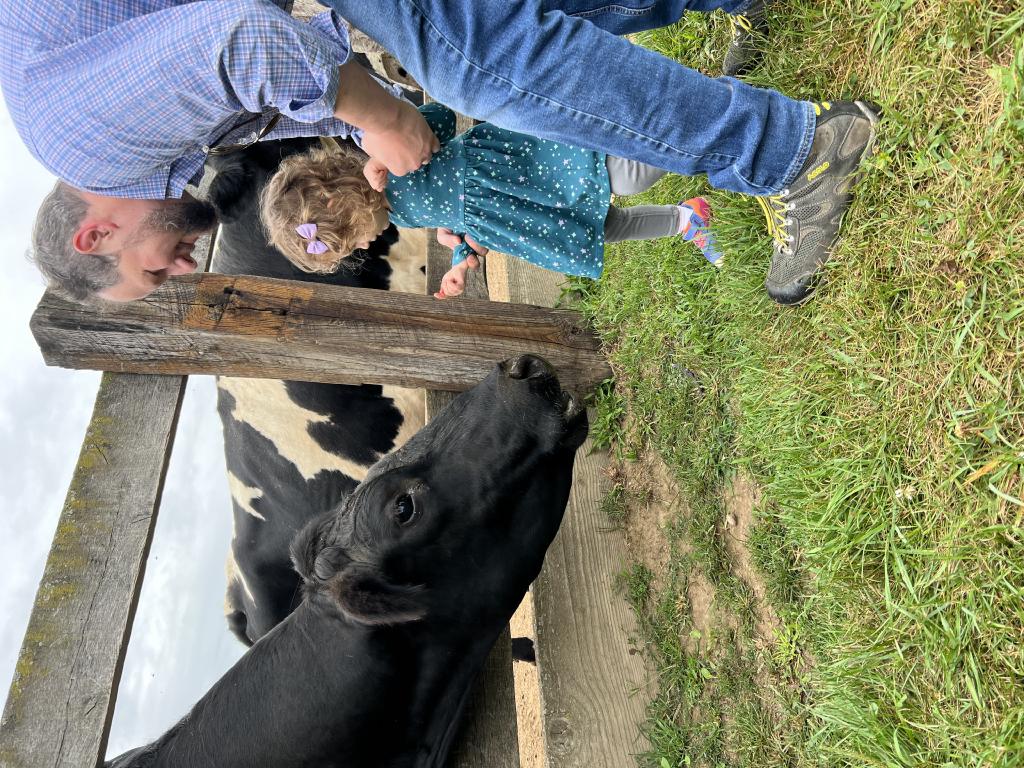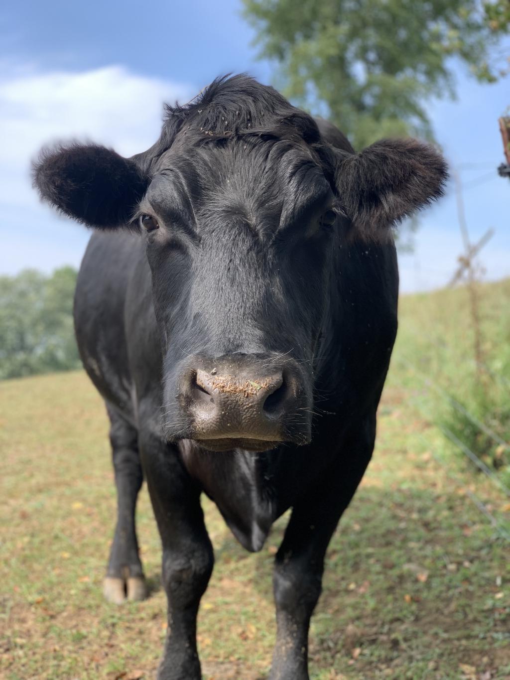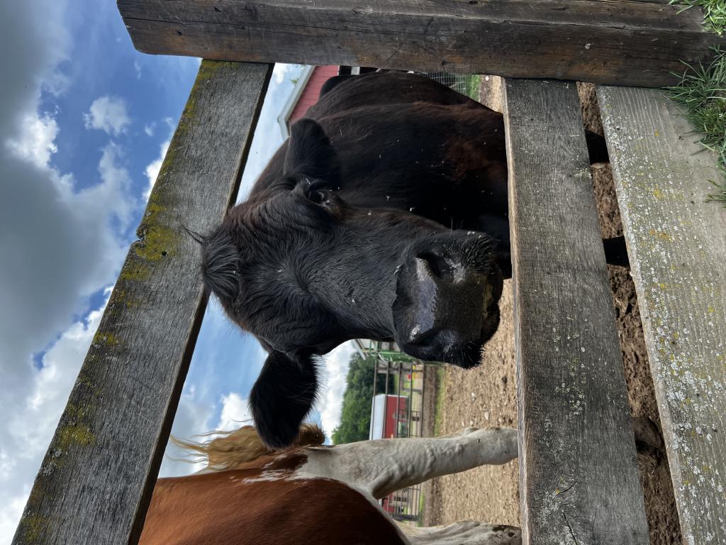 Daisy, a Black Angus, was pregnant when she came to SASHA in June of 2014, was rescued from a backyard butcher who was running a small slaughterhouse in Riga, Mich. She was kept alive for the sole purpose of producing calves for meat. Daisy had given birth to three calves before her rescue. Knowing humans only as the people responsible for taking her babies away from her, Daisy was understandably averse to humans upon being rescued by SASHA staff. After six days at SASHA, she gave birth to Lucky.