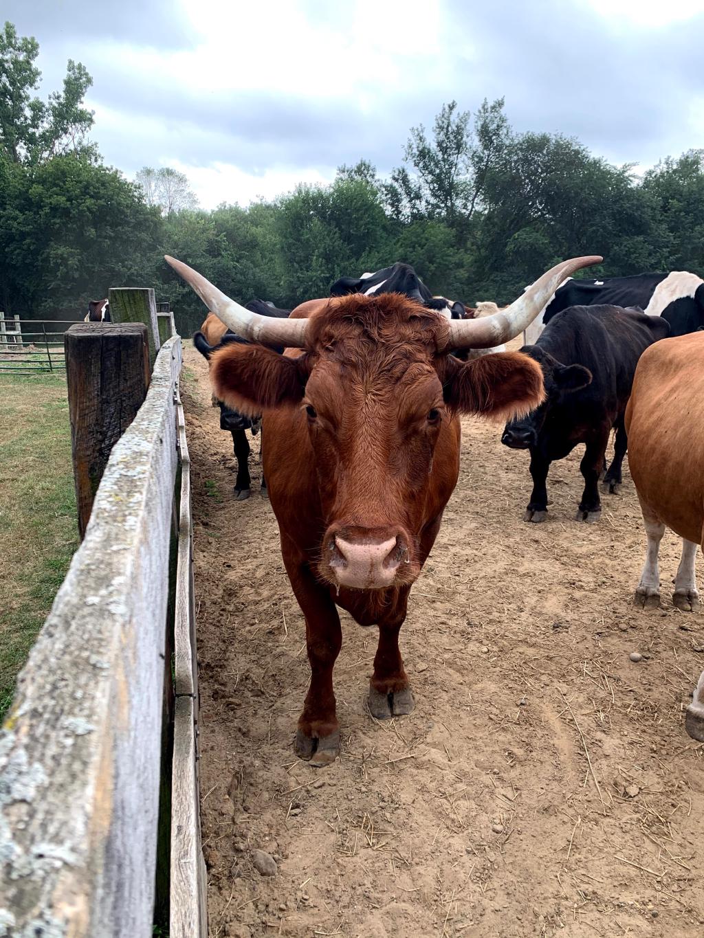 Mr. Rogers is a magnificent looking Salers/Red Angus mixed breed, brown-ish red, with rather small horns. He was born at SASHA Farm on August 20, 2010, one week after his mother Bella escaped a transport truck packed with cows on their way to be slaughtered. Bella survived the crash and ran off. Monte Jackson and Bob Harvie from SASHA were called in to help, and they picked her up near Grand Rapids, MI. She joined the SASHA Family the next day, very thin and hardly able to walk. At the time she was pregnant, but no one was aware of her pregnancy.