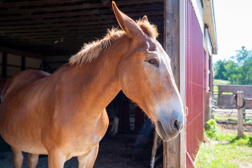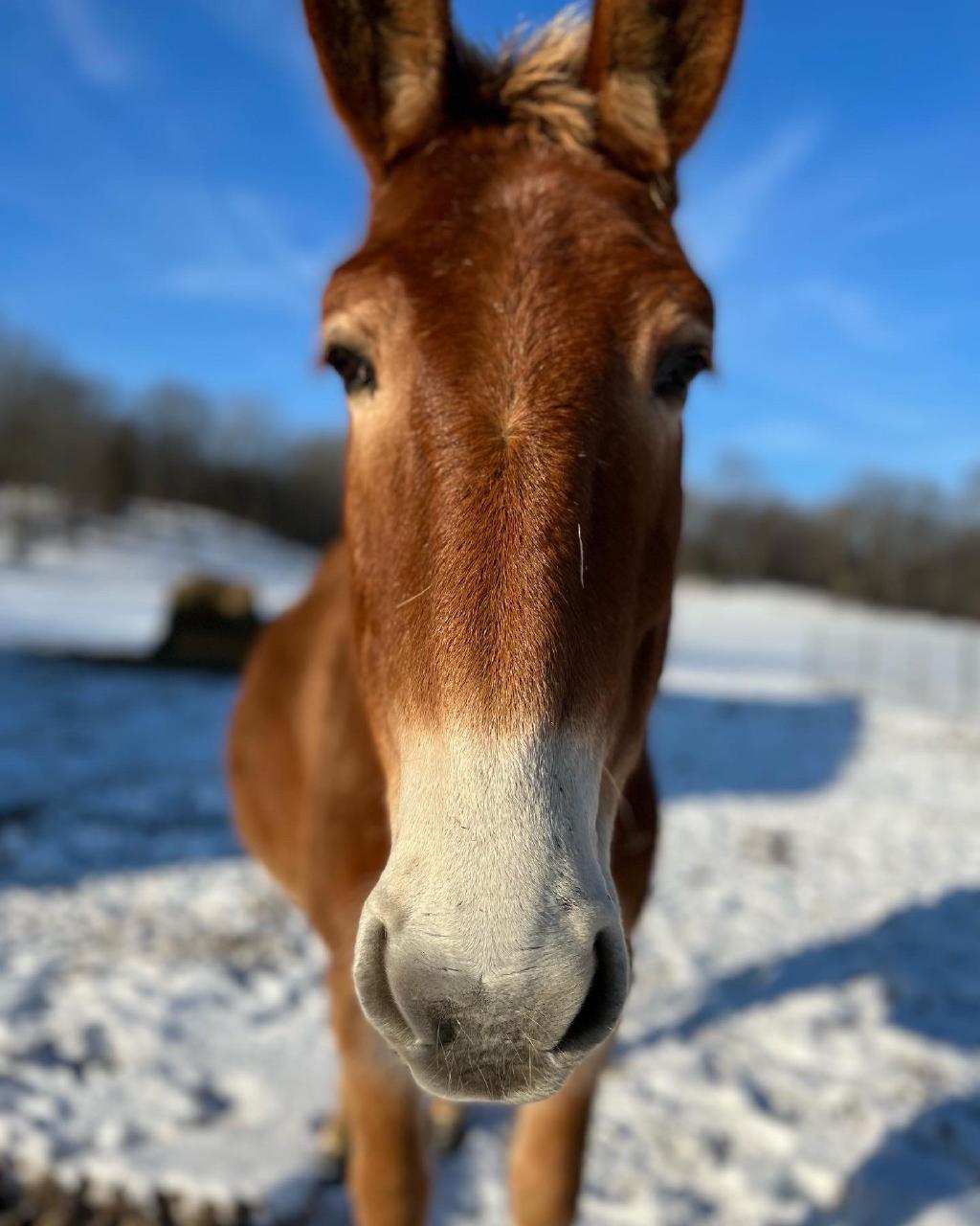 SASHA Farm received information about 3 equines that had no place to go and time was running out. The people who cared for these 3 animals had fallen on very hard times and their property was being foreclosed on, so they had to move, and the horse and mules could not go with them. We did not want to see these beautiful animals end up in uncertain circumstances, so Dorothy Davies and Monte Jackson drove to the Gaylord MI area to pick them up. Now, 5 years later, they are safe and happy at SASHA Farm. Brute is a sweet horse and has a little bit of sass. Walker and Angel are super gentle mules and like two peas in a pod