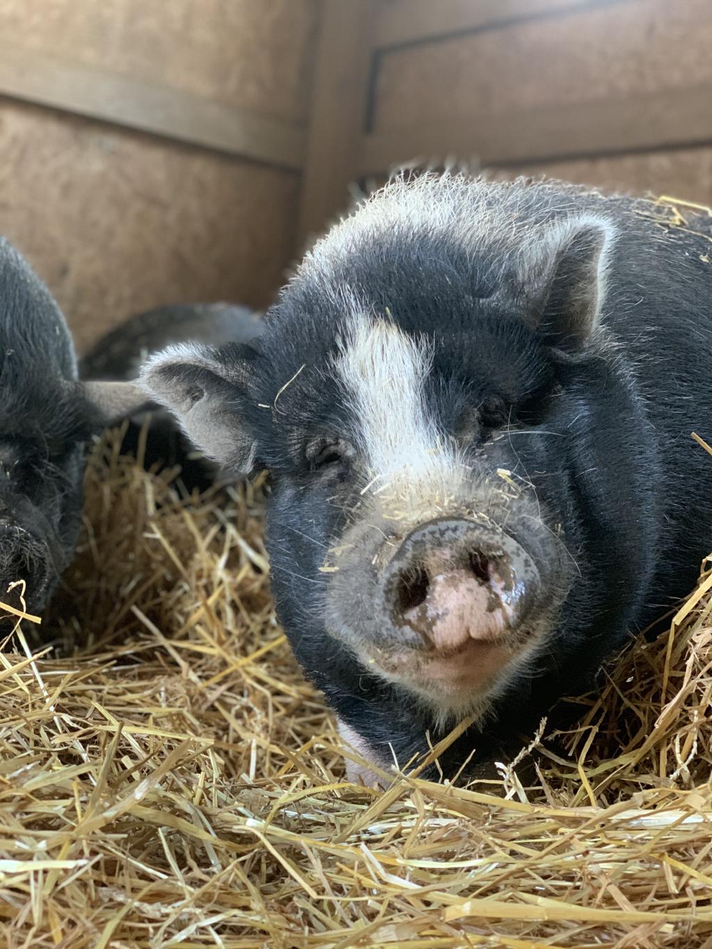 Louie is quite big, with a large white stripe down his forehead. He is very shy, startles easily, and prefers not to be petted, other than an occasional belly rub. He came to SASHA as a piglet.